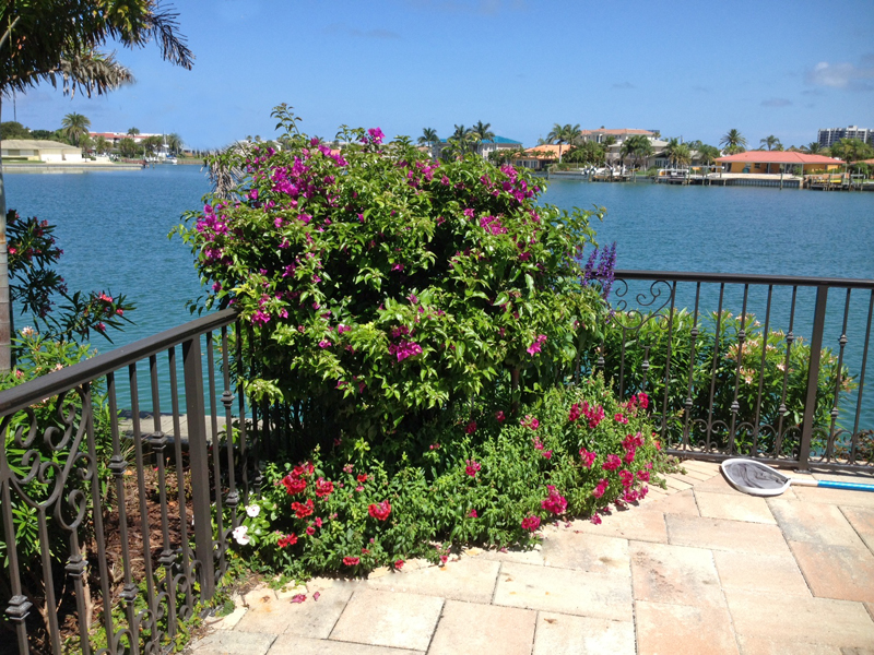 Both corners are softened with Bougainvillea for height and annuals floor level color. Layering a small space increases the effect. Mindful not to block the view, I like to enhance the corner areas to provide privacy from the neighbors.